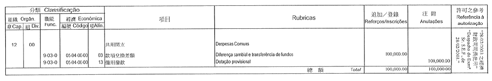 根據九月二十七日第53/93/M號法令第十九條的規定,茲公佈經行政長官二零零三年二月二十六日批示許可之二零零三年度澳門基金會本身預算之第一次修改: