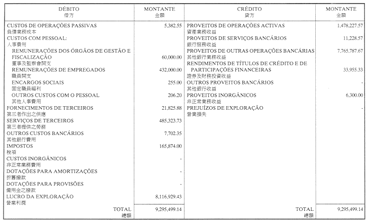 在經過對財務演算表進行分析後,沒有發現任何違反現行法規或不當事情,因此,確定財務演算表是採用業界一般採用的計價標準和會計標準。資產負債表和營運帳目是按照銀行界所依循的公定會計格式編制。總的來說,提交查閱的帳目文件忠實地反映去年十二月三十日止銀行的營運結果和財產狀況。