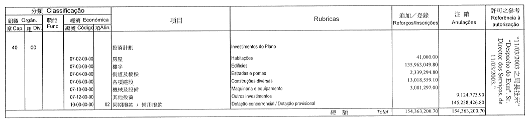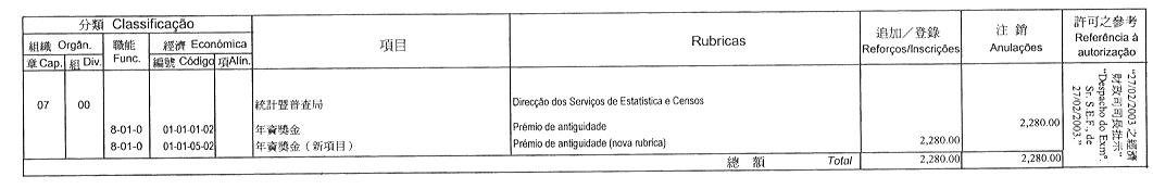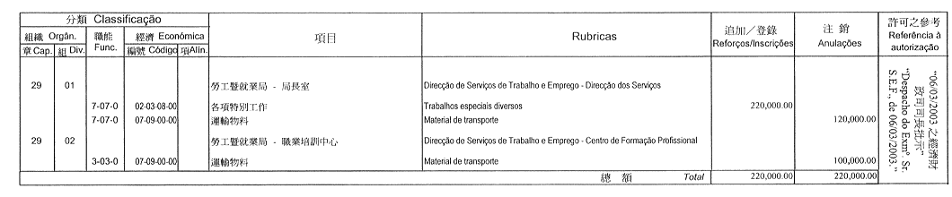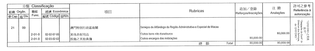 根據四月三十日第17/GM/87號批示,茲公布下列(澳門特別行政區財政預算/二零零三)款項轉帳,該轉帳由經四月二十七日第22/87/M號法令第一條修訂的十一月二十一日第41/83/M號法令第二十一條第三項規定所核准: