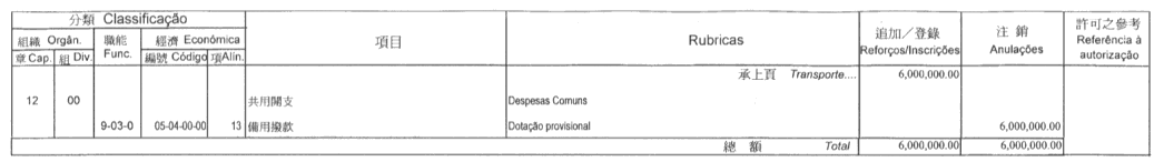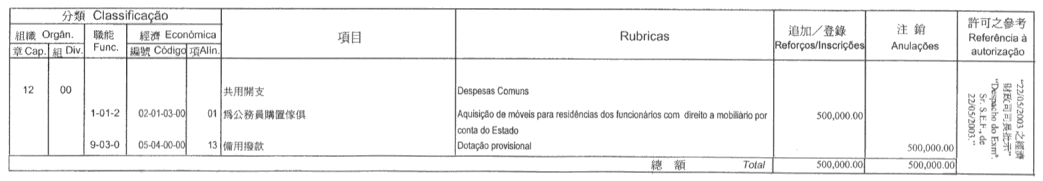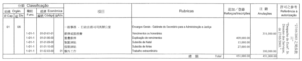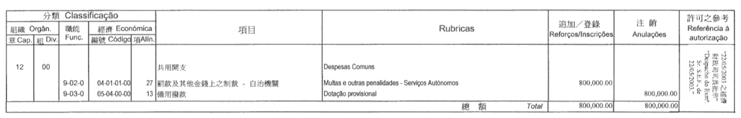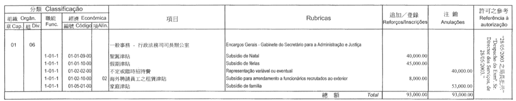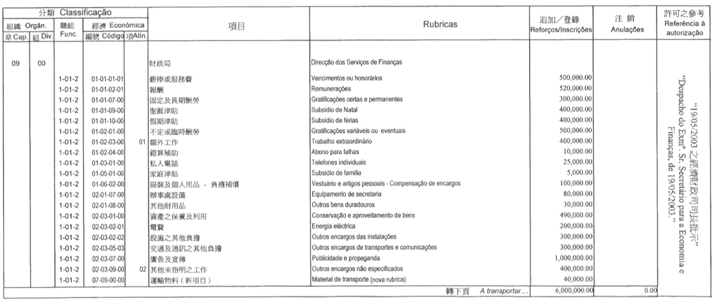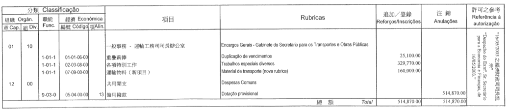 根據四月三十日第17/GM/87號批示,茲公布下列(澳門特別行政區財政預算/二零零三)款項轉帳,該轉帳由經四月二十七日第22/87/M號法令第一條修訂的十一月二十一日第41/83/M號法令第二十一條第三項規定所核准: