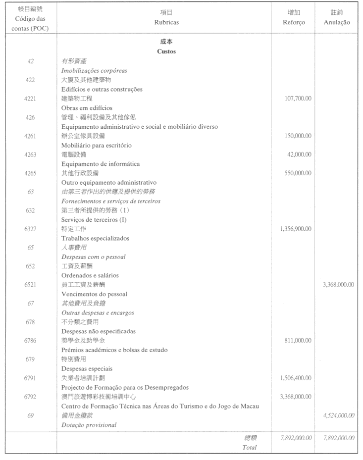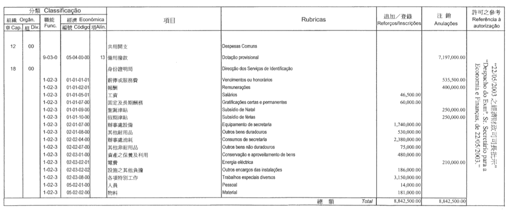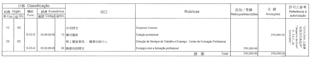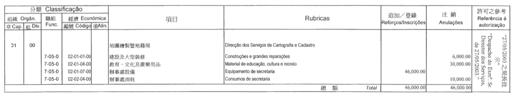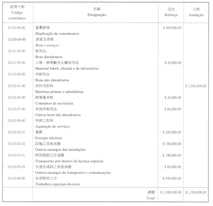 根據九月二十七日第53/93/M號法令第十九條規定,公佈經運輸工務司司長於二零零三年五月二十六日批示核准的有關二零零三年度政府船塢本身預算的第一次修改: