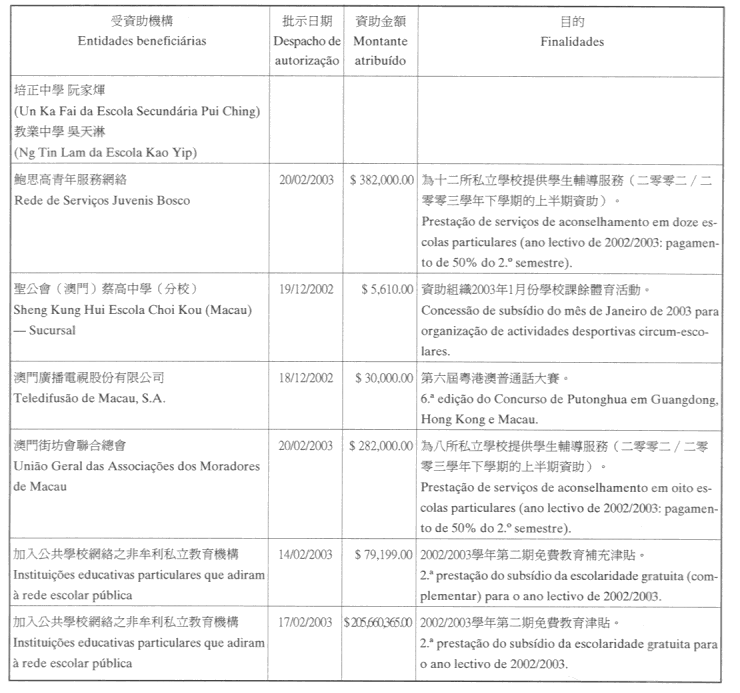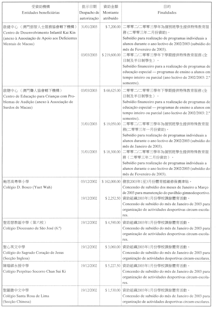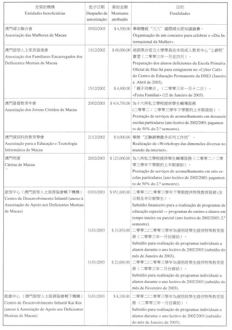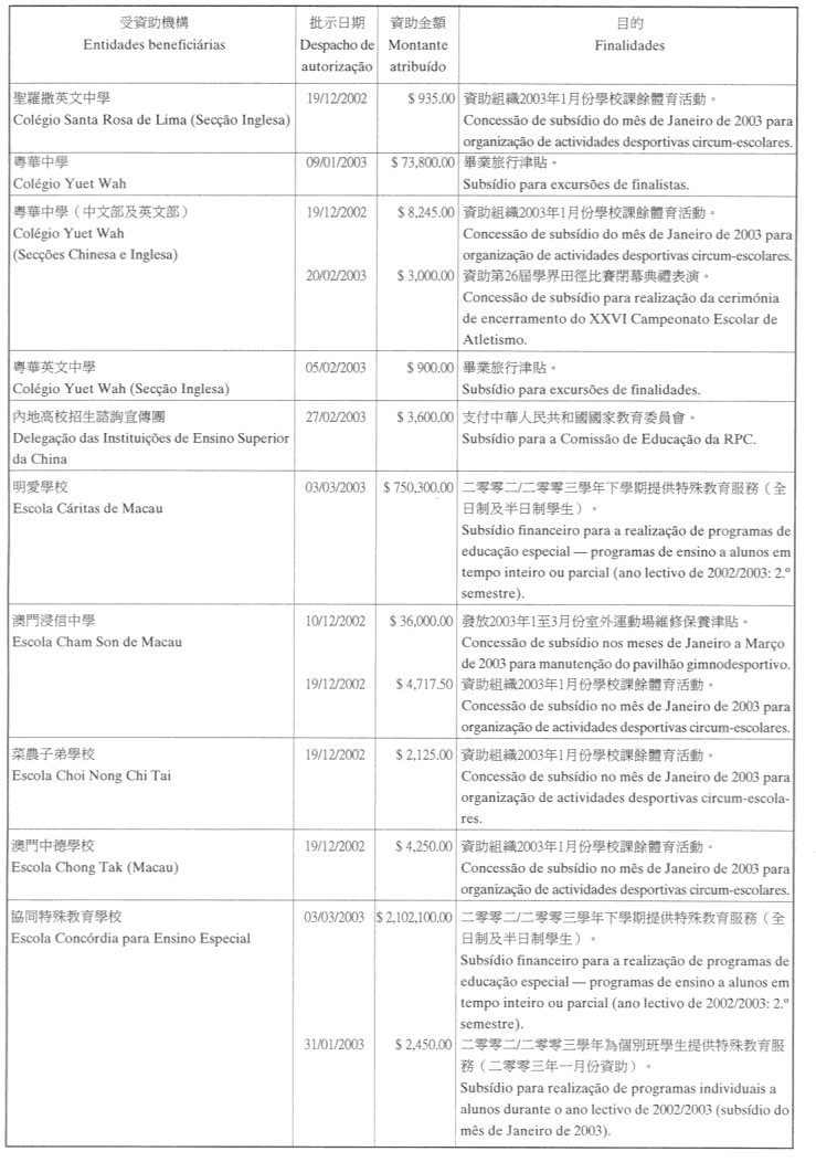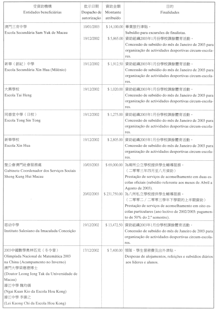 Em cumprimento do Despacho n.º 54/GM/97, de 26 de Agosto, referente aos apoios financeiros concedidos a particulares e instituições particulares, vem a Direcção dos Serviços de Educação e Juventude publicar a listagem dos apoios concedidos no primeiro trimestre de 2003: