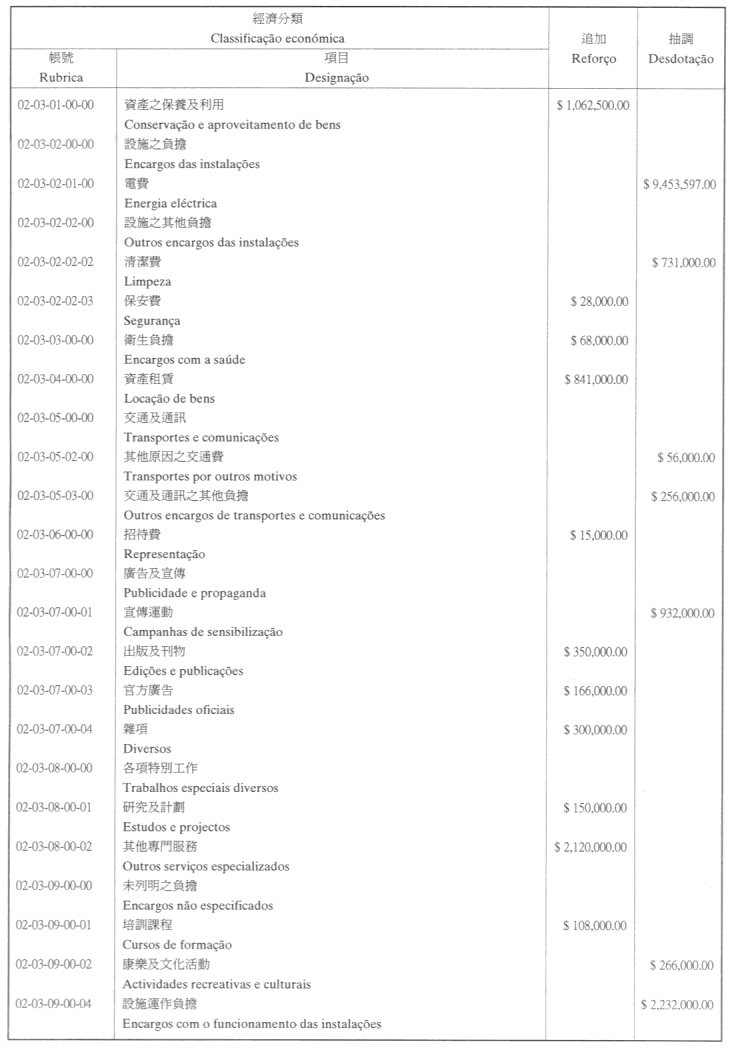 De acordo com o artigo 19.º do Decreto-Lei n.º 53/93/M, de 27 de Setembro, publica-se a 2.ª alteração orçamental da Fundação Macau, autorizada por despacho de 10 de Junho de 2003 de S. Ex.ª o Chefe do Executivo: