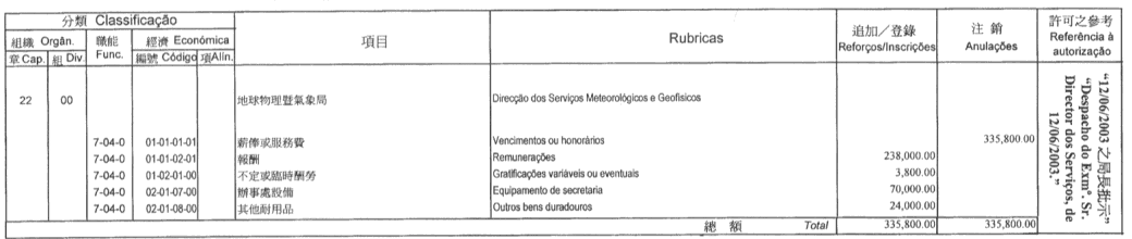 Operários, 7.º escalão, índice 180: Chao Kuong Io, Chao Kuong Tak, Chao Meng, Chau Kong Choi e Chong Pou Long; 6.º escalão, índice 160: Lei Hon Man, aliás Lei Hung Man; 5.º escalão, índice 150: Chio Man Kun, Leong Kun Fan, Loi Kuai Leong, Sin Iat Meng, Wong Chu Wa e Wong Wa Pan, todos a partir de 1 de Julho de 2003;