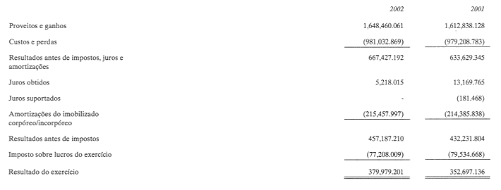 Das demonstrações financeiras da Empresa, constata-se que 2002 assistiu a um aumento de 8% do lucro líquido depois de impostos e a um aumento de 2% nas receitas.