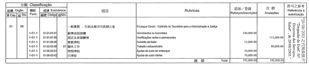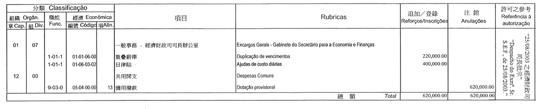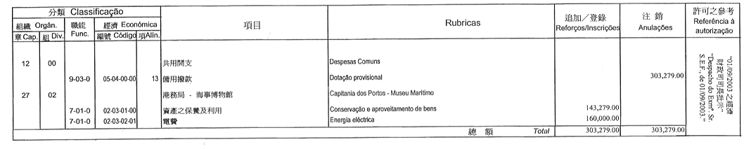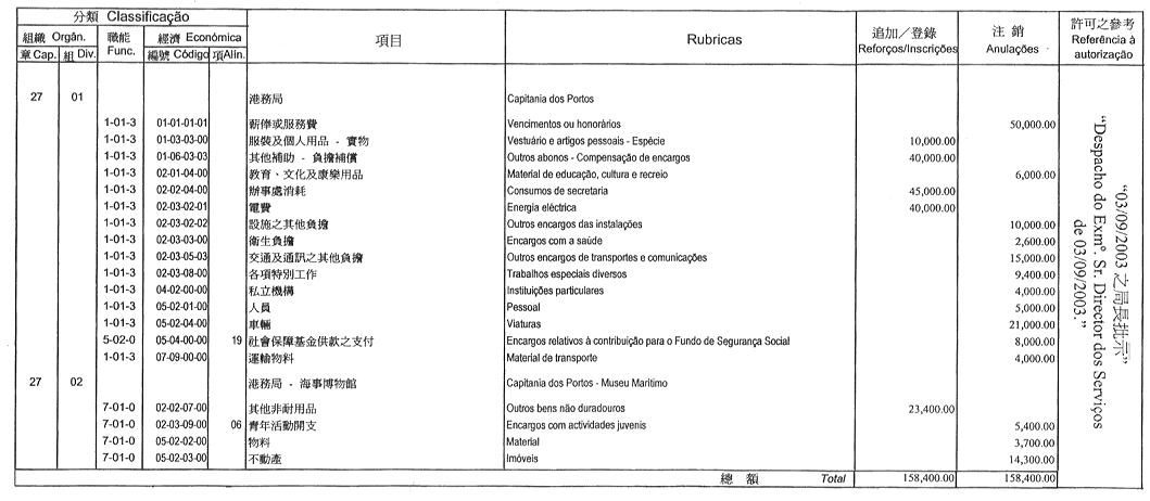 根據四月三十日第17/GM/87號批示,茲公布下列(澳門特別行政區財政預算/二零零三)款項轉帳,該轉帳由經四月二十七日第22/87/M號法令第一條修訂的十一月二十一日第41/83/M號法令第二十一條第三項規定所核准: