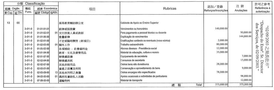 根據四月二十七日第21/87/M號法令,以及十二月二十一日第87/89/M號法令核准,並經十二月二十八日第62/98/M號法令修訂之《澳門公共行政工作人員通則》第二十五條和第二十六條之規定,António Jorge Gonçalves Ferreira學士及具高等專科學位的António Manuel Pereira Ramalho Gomes的編制外合同獲續期一年,分別擔任一級第一階段葡文中學教師及一級第五階段葡文預備中學教師,薪俸點為430及625,由二零零三年九月一日起生效。