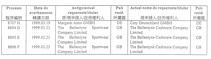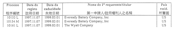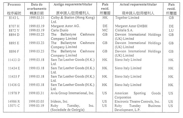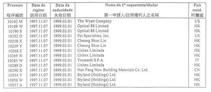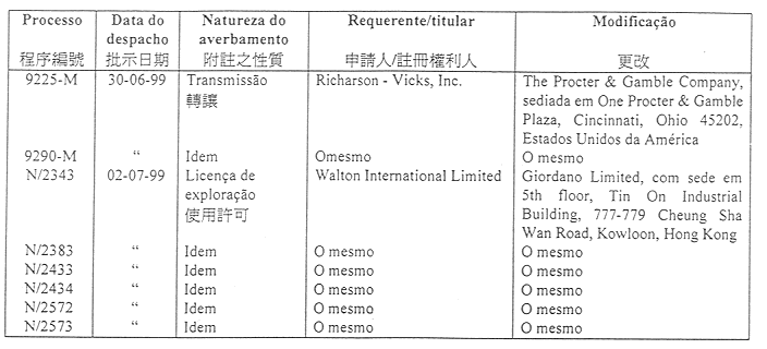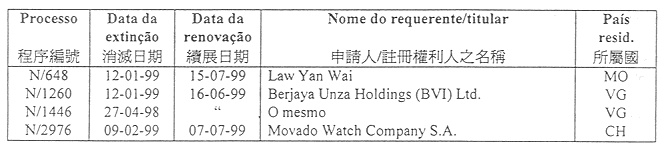 根據公布於一九九五年九月四日第三十六期第一組《澳門政府公報》內之一月二十四日第16/95號法令第二百九十二條第二款,以下公布續展、失效、附註,及放棄之名單: