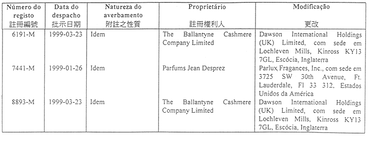 商標編號10 593-M - 在附註表之更改認別資料的“註冊編號”欄目內,原文為:“15593-M”