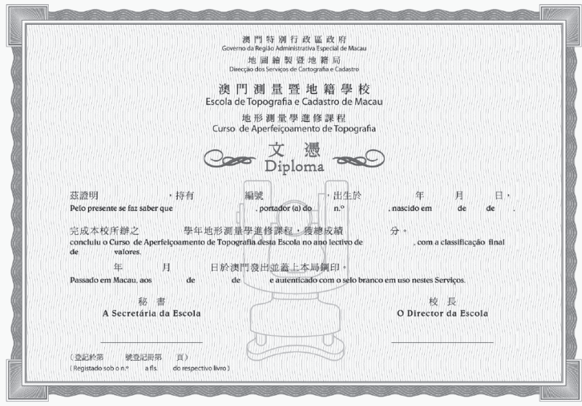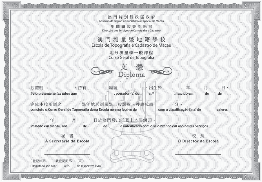 2. O diploma do Curso Geral de Topografia é impresso em papel de cor creme-amarelado e de formato A4, com cercadura de cor verde escura sobre o fundo de cor verde clara, o centro é apresentado de uma figura de teodolito de cor clara, com caracteres de cor preta.