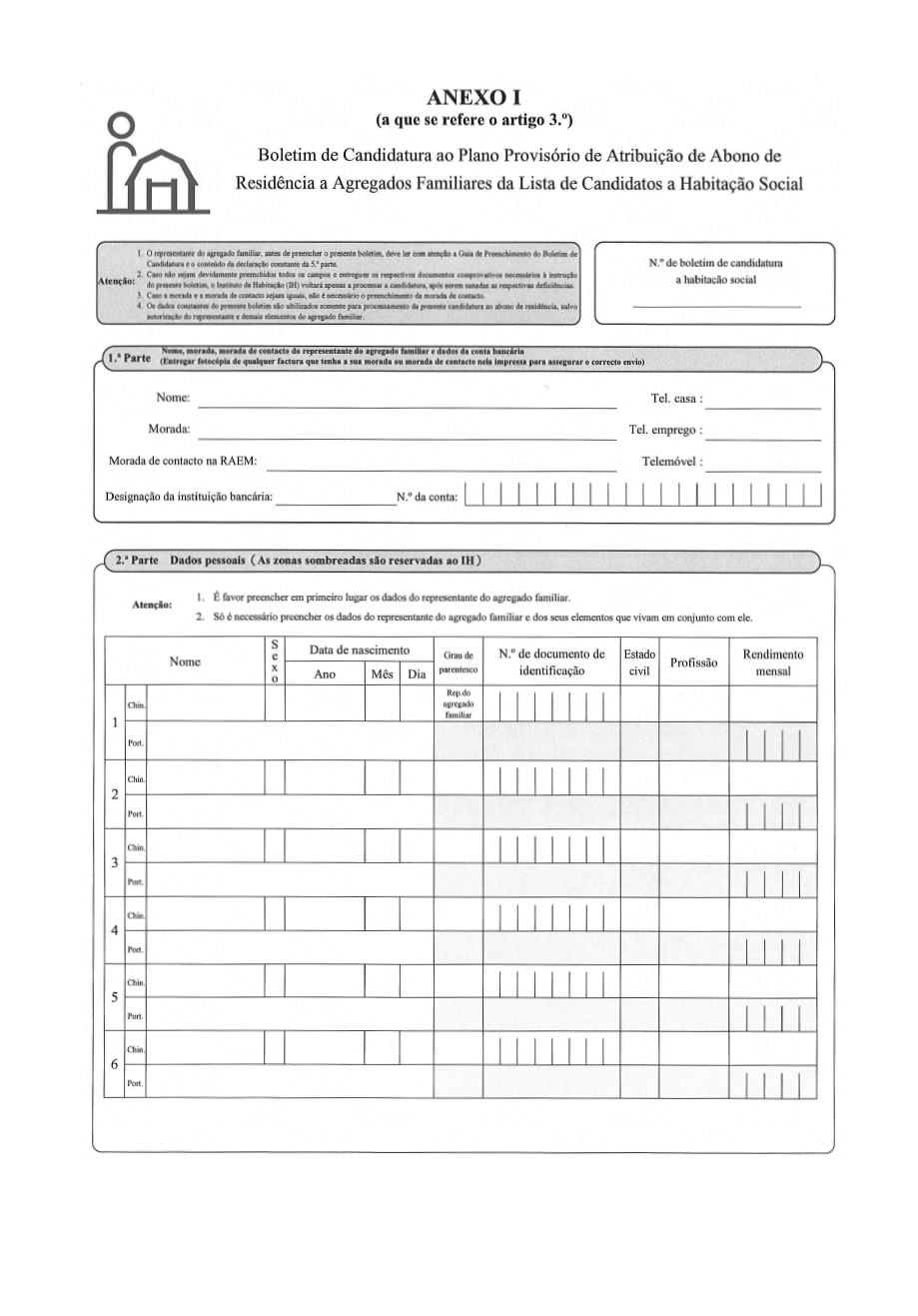 1) Cópia do bilhete de identidade de residente de cada elemento do agregado familiar requerente;