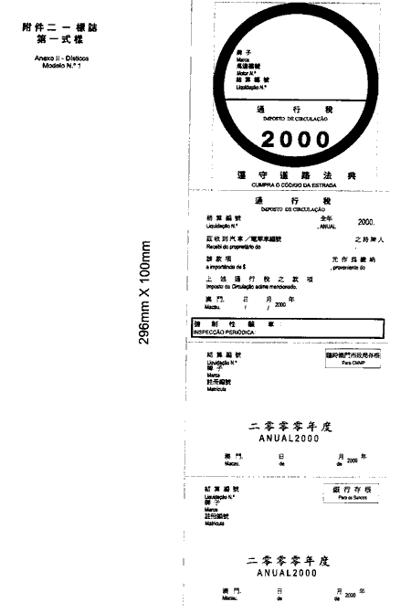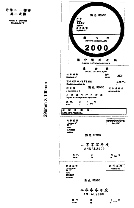 (一)經八月十二日第16/96/M號法律通過的車輛使用牌照稅規章附件二所載的標誌式樣,由附載於本行政法規並成為其組成部份的標誌式樣取代。