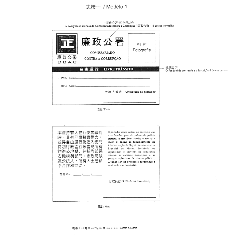 三、證件預先印有中文及葡文,並應填寫持證人的姓名及以中、葡文寫上所擔任的職務。