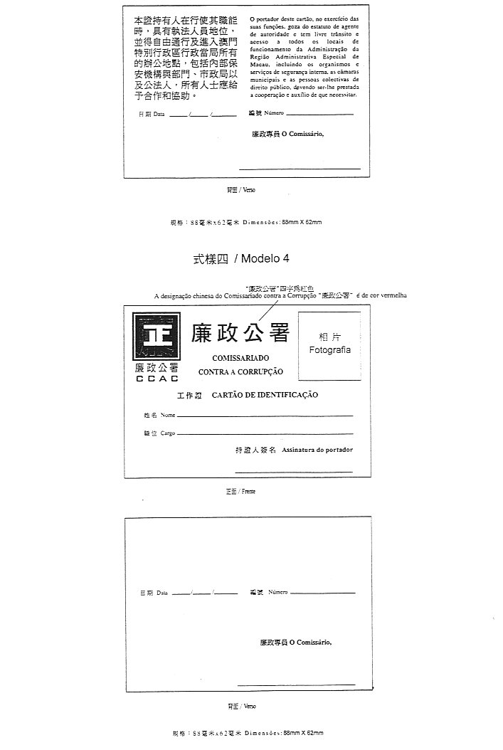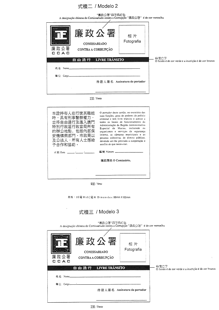 二、式樣一證件為廉政專員專用,式樣二證件供具有刑事警察權力的廉政公署人員使用,式樣三證件供具有執法人員地位的廉政公署人員使用,而式樣四證件供其餘的廉政公署人員使用。