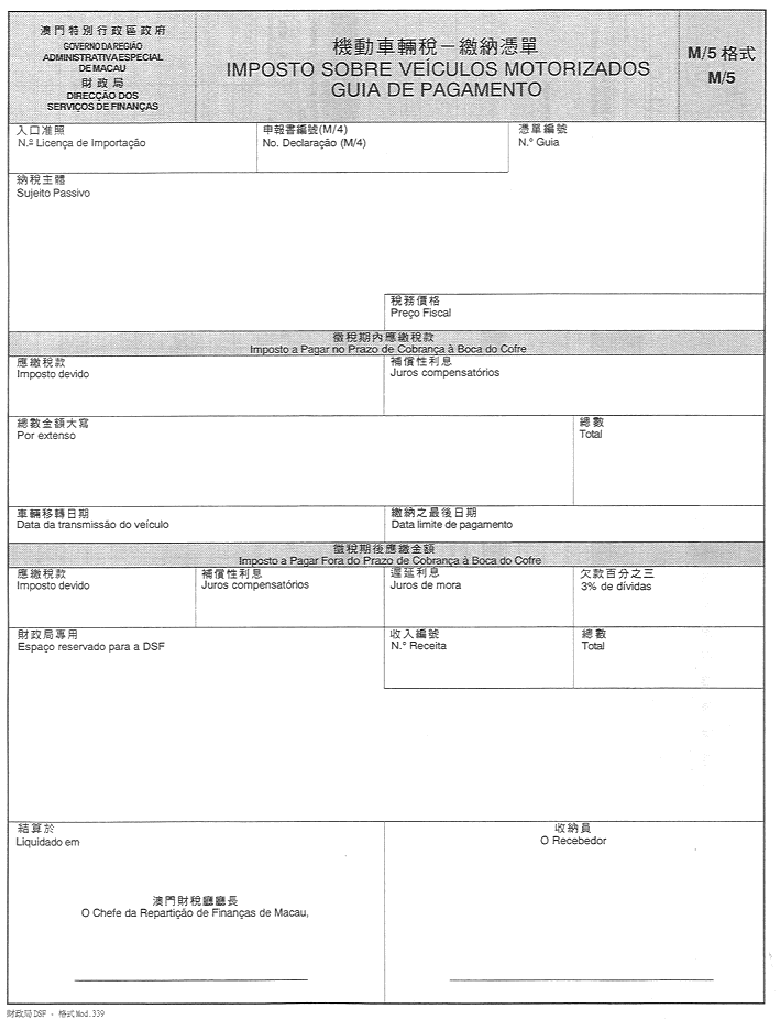 三、制訂徵收機動車輛稅之用的繳納憑單M/5,以取代不定期收入憑單M/B。