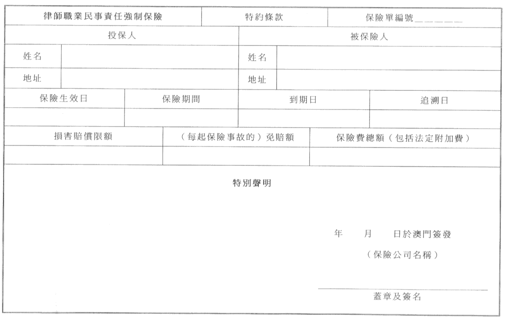 三、為適用上款規定,被保險人應以掛號信或其他書面記錄方式,將受保險合同保障的非律師合作者及實習律師的名單通知保險人,否則,將不獲保險合同保障。