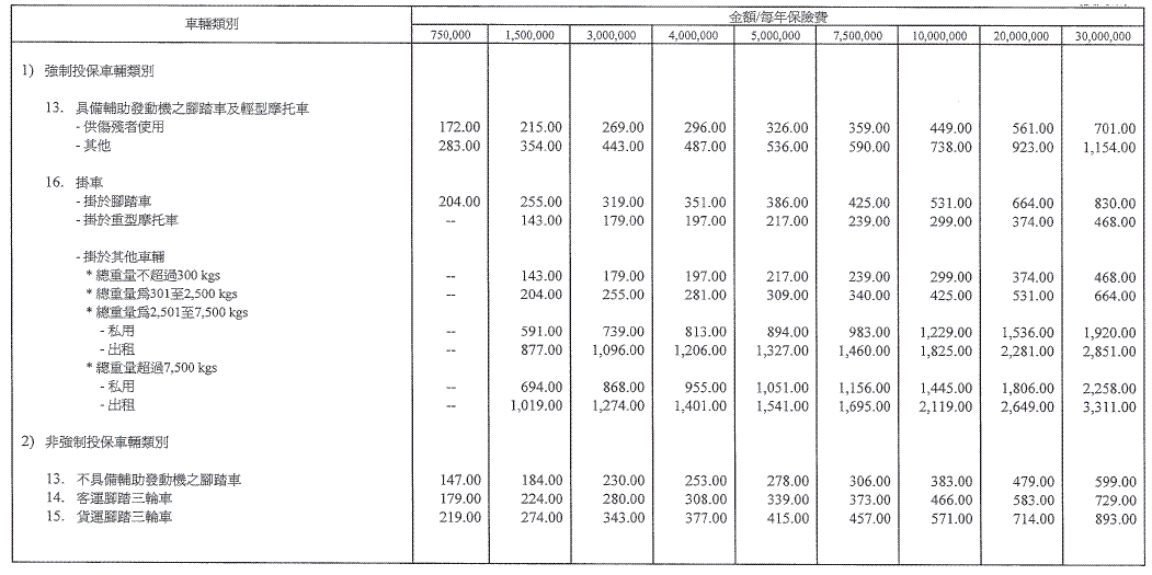 (除“腳踏車”、“三輪車”、“掛車”及“特別類別”外之所有類別車輛之風險I保險費表)