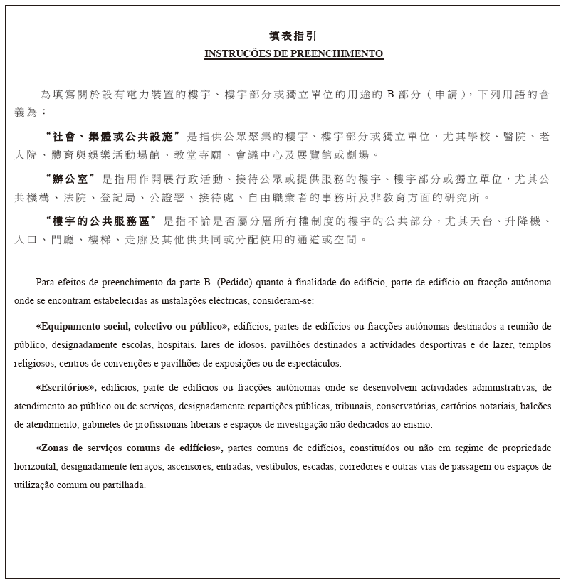 二、有關電力裝置的檢查及確定使用准照的申請,應藉提交作為本行政法規組成部分的附件二所載的表格一併提出;申請時,應附同供電計劃和已在土地工務運輸局註冊並負責編製該供電計劃的技術員的聲明書,其內須聲明電力裝置已按該計劃及現行的規章性規定安裝。