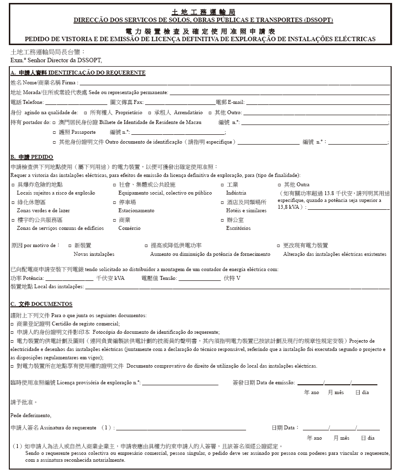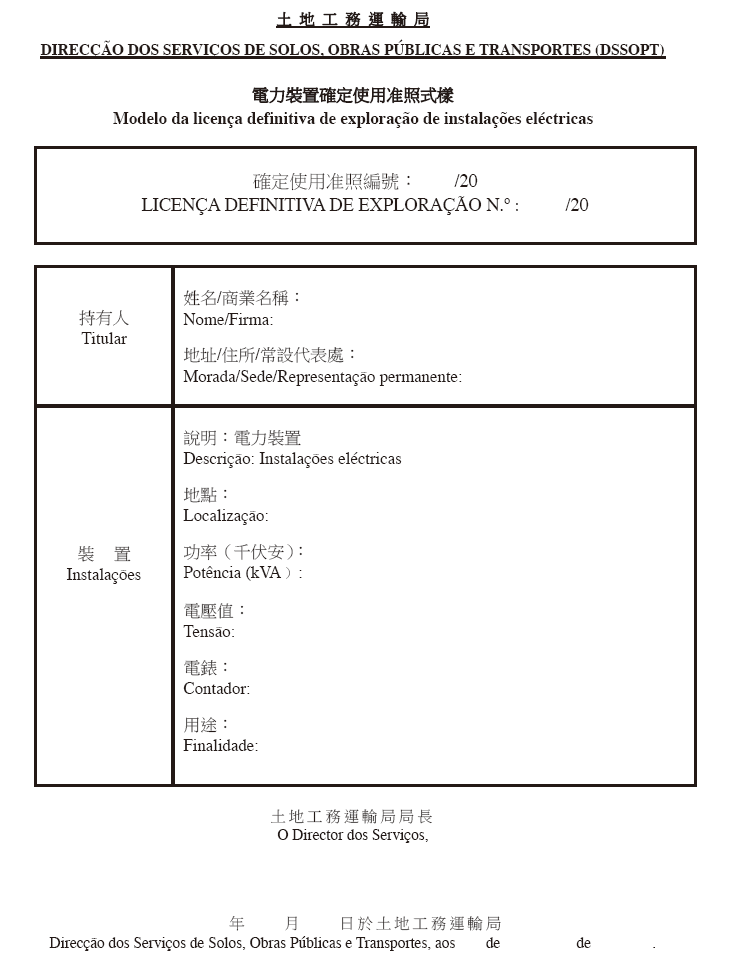 一、臨時使用准照持有人應在准照有效期內向土地工務運輸局申請檢查電力裝置,以便該局發出確定使用准照。