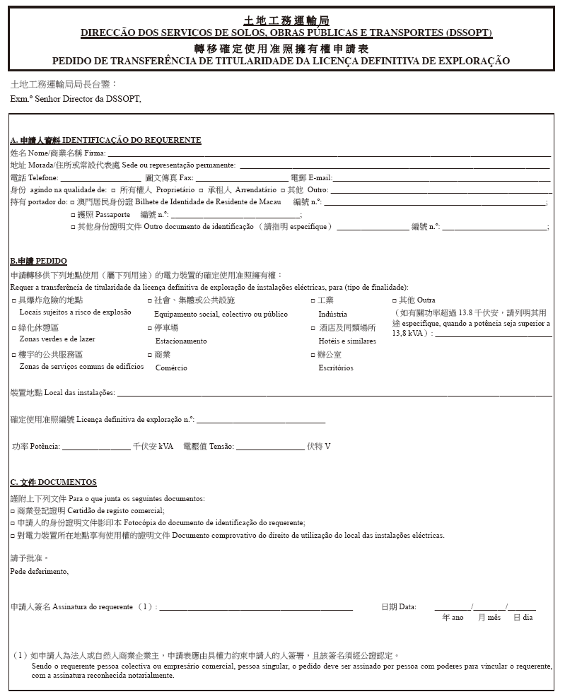 一、上條所指裝置的供電合同,在該等裝置具備土地工務運輸局發出的相關臨時使用准照的情況下,方可簽訂;申請該臨時使用准照,須由所有權人、承租人或具正當性的人藉提交作為本行政法規組成部分的附件一所載的表格提出。