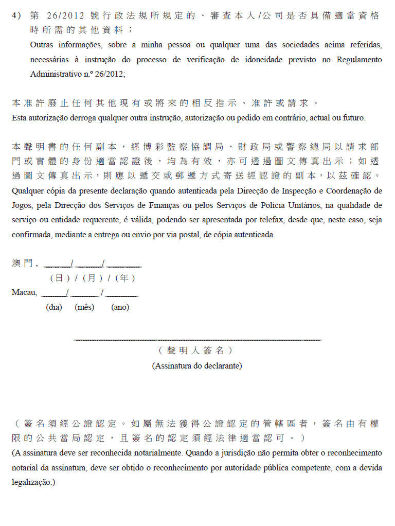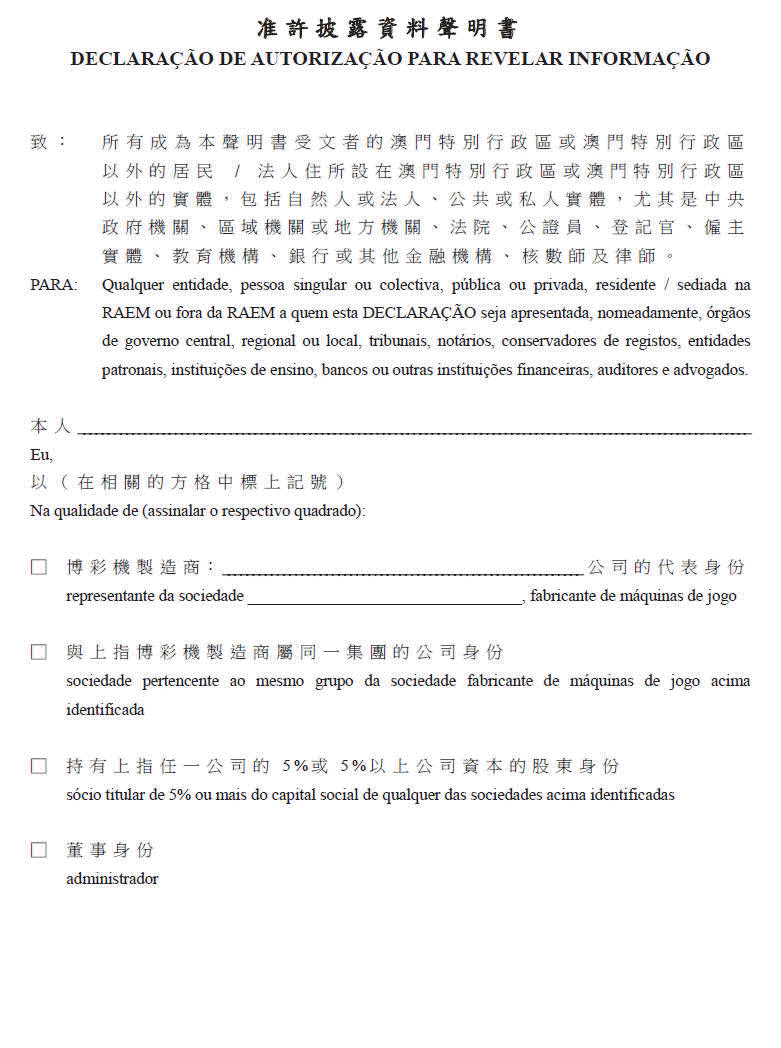 1. Para efeitos de verificação da respectiva idoneidade, os fabricantes de máquinas de jogo e todas as pessoas e entidades que estejam obrigadas a preencher os formulários referidos no n.º 2 do artigo 5.º autorizam o Governo a aceder aos documentos, informações e dados que o mesmo considere necessários para tal verificação, ainda que protegidos por dever de sigilo, submetendo ao Governo um exemplar da «Declaração de Autorização para Revelar Informação», cujo modelo constitui Anexo ao presente regulamento administrativo e dele faz parte integrante, devidamente preenchido e assinado, com reconhecimento notarial das assinaturas.