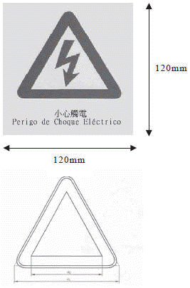 Dentro do quadrado existe um triângulo equilátero e debaixo deste a inscrição a preto, em chinês «小心觸電» e em português «Perigo de Choque Eléctrico», em caracteres com 10 mm de altura.