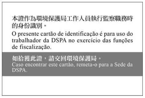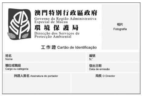 二、工作證為白色,尺寸為90毫米x60毫米,並印有環境保護局標誌,以及“澳門特別行政區政府”、“環境保護局”和“工作證”之中、葡文字樣。
