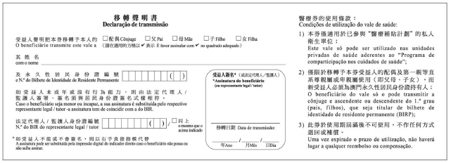 二、根據第11/2016號行政法規《二零一六年度醫療補貼計劃》第五條第六款的規定將醫療券移轉予受益人的配偶、第一親等直系血親尊親屬或卑親屬,須簽署移轉聲明書和將之交予被背書人。