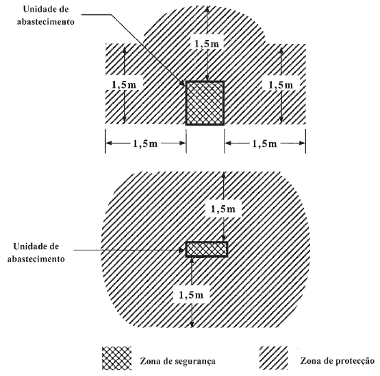 1. A zona de protecção das unidades de abastecimento de gasolina e gasóleo corresponde à respectiva zona circundante até 2 m, em todas as direcções, limitada superiormente por um plano horizontal situado a 0,5 m do nível da base da unidade e inferiormente pelo nível do solo, conforme a figura que constitui o anexo I.