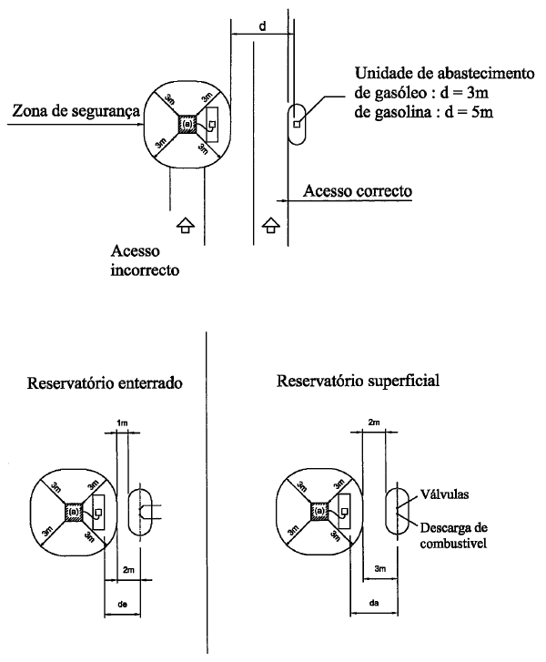 1. A zona de segurança das unidades de abastecimento de gasolina e gasóleo corresponde à respectiva zona circundante até 0,5 m, em todas as direcções e, no mínimo, limitada superiormente por um plano horizontal situado a 1,2 m do nível da base da unidade e inferiormente pelo nível do solo, conforme a figura que constitui o anexo I.