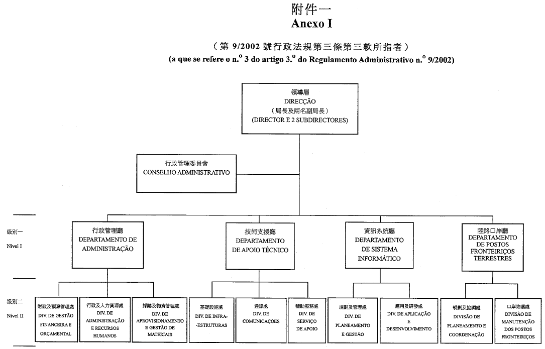 一、第9/2002號行政法規第三條第三款所指的附件A所載的澳門保安部隊事務局的組織結構圖及主管級別,由作為本行政法規組成部分的附件一所載者取代。