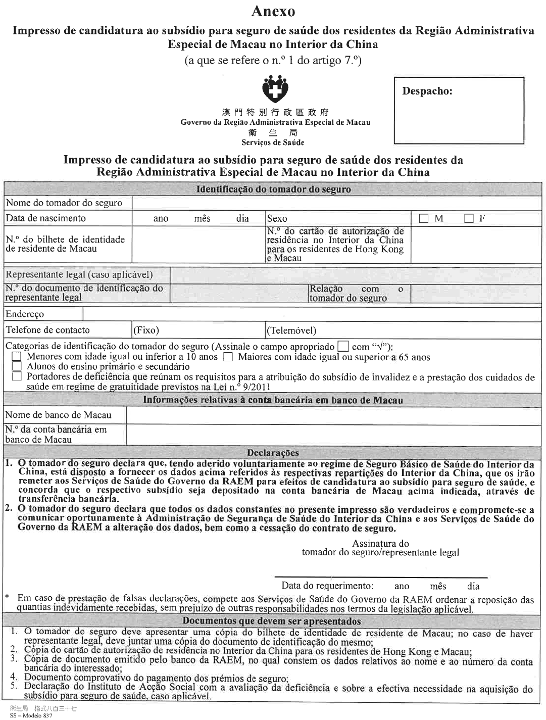 Programa do subsídio para seguro de saúde dos residentes da Região Administrativa Especial de Macau no Interior da China