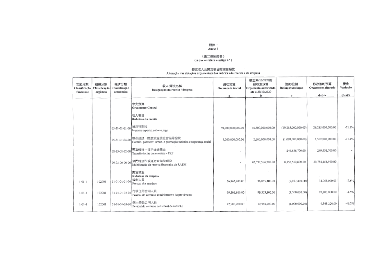 修改澳門特別行政區二零二零年財政年度預算,是透過減少或追加載於作為本法律組成部分的附件一內的一般綜合預算收入項目和開支項目的預算金額、特定機構彙總預算收入項目及開支項目的預算金額,以及特定機構彙總投資預算開支項目的預算金額。