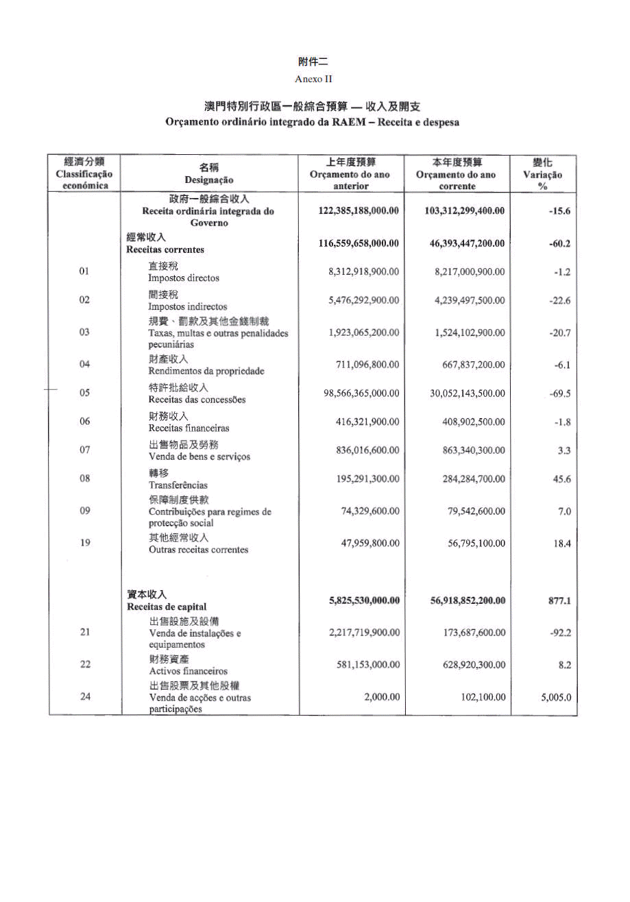 一、二零二零年財政年度澳門特別行政區一般綜合預算的收入總額為$103,312,299,400.00(澳門元壹仟零叁拾叁億壹仟貳佰貳拾玖萬玖仟肆佰元)。