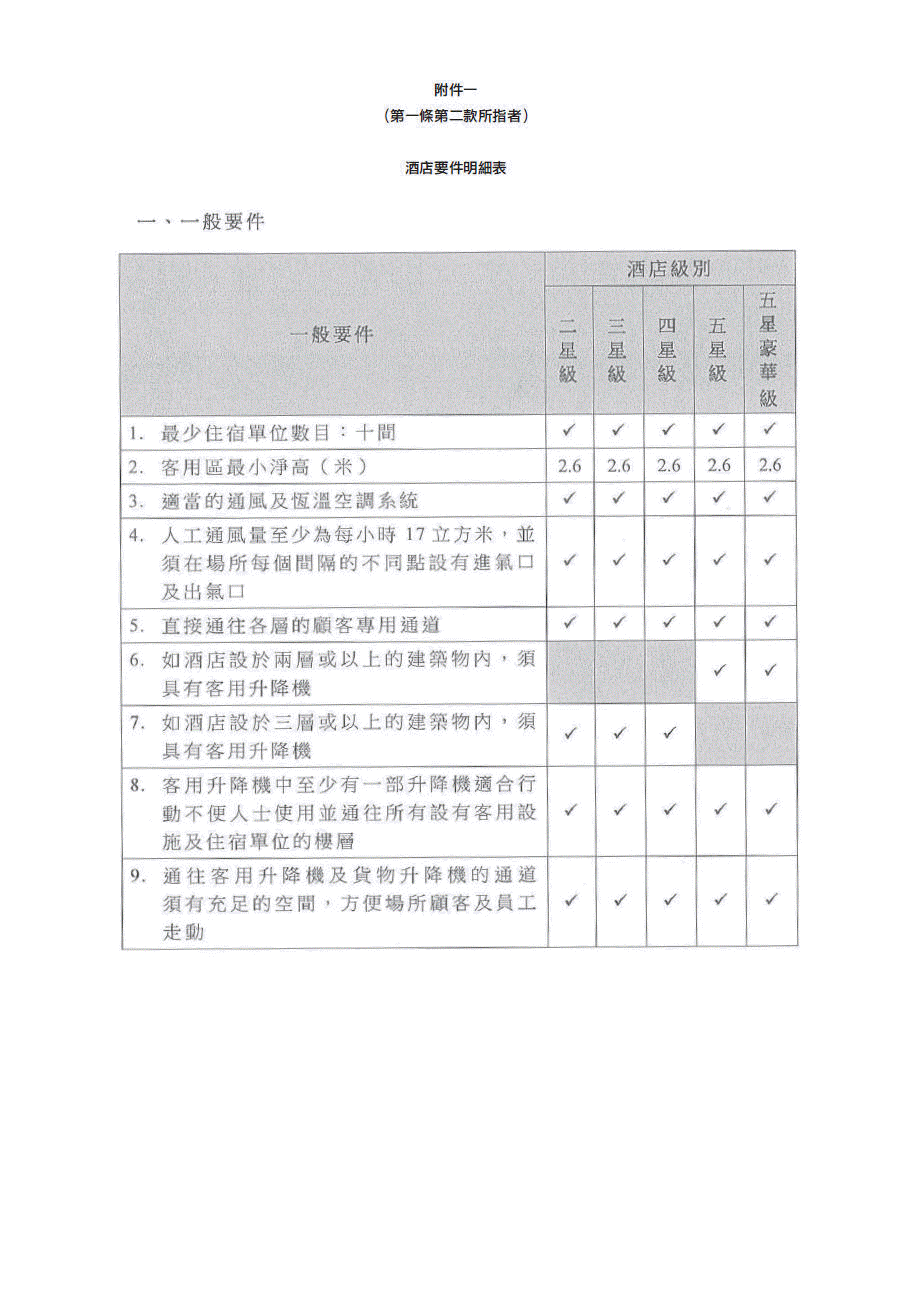 二、《酒店要件明細表》、《公寓式酒店要件明細表》、《經濟型住宿場所要件明細表》、《美食廣場及食品攤檔要件明細表》、《餐廳、簡便餐飲場所、酒吧及舞廳要件明細表》及《廚房及作業區最小面積》,載於作為本行政法規組成部分的附件一至附件六。