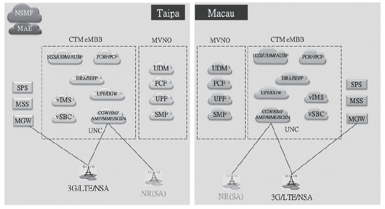 2) A rede nuclear: a China Telecom Macau irá construir uma nova e optimizada rede 5G, com tecnologias mais avançadas e que servirá propósitos comerciais. Enquanto isso, a rede nuclear de 4G será progressivamente actualizada, para permitir uma distribuição combinada 4G/5G, isto é, a implementação combinada de elementos da rede, como SMF/GW-C, UPF/GW-U, PCF/PCRF e UDM/HSS. Através da interacção e comunicação na sua rede nuclear, a rede 5G permitirá uma distribuição articulada entre 4G/5G, o que oferece uma maior velocidade e capacidade da banda larga, permitindo um carregamento rápido e ágil dos serviços. Os elementos da rede principais têm as seguintes funções: