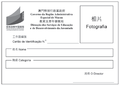 二、工作證為白色,尺寸為88毫米x62毫米,上方印有教育及青年發展局的標誌、“澳門特別行政區政府”及“教育及青年發展局”的中、葡文字樣。