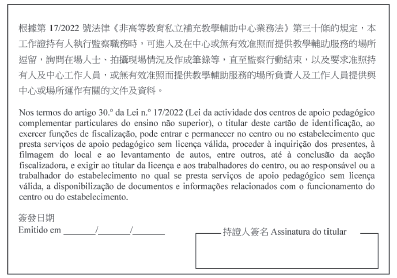 三、工作證由教育及青年發展局局長或其法定代任人簽署,並在持證人相片的左下角蓋上教育及青年發展局專用鋼印以資認證。