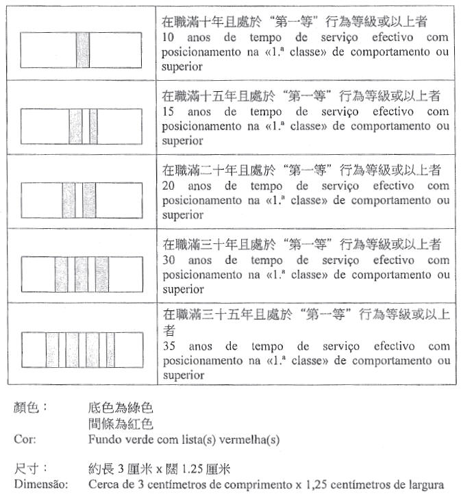 1) Para os agentes de posto igual ou superior a inspector alfandegário, o círculo interior do emblema da RAEM tem fundo verde, sendo a coroa circular e as cinco estrelas de cor dourada. Os restantes componentes do emblema do boné são bordados a fio prateado em tecido, que é de cor preta para o boné azul escuro e de cor branca para o boné branco;