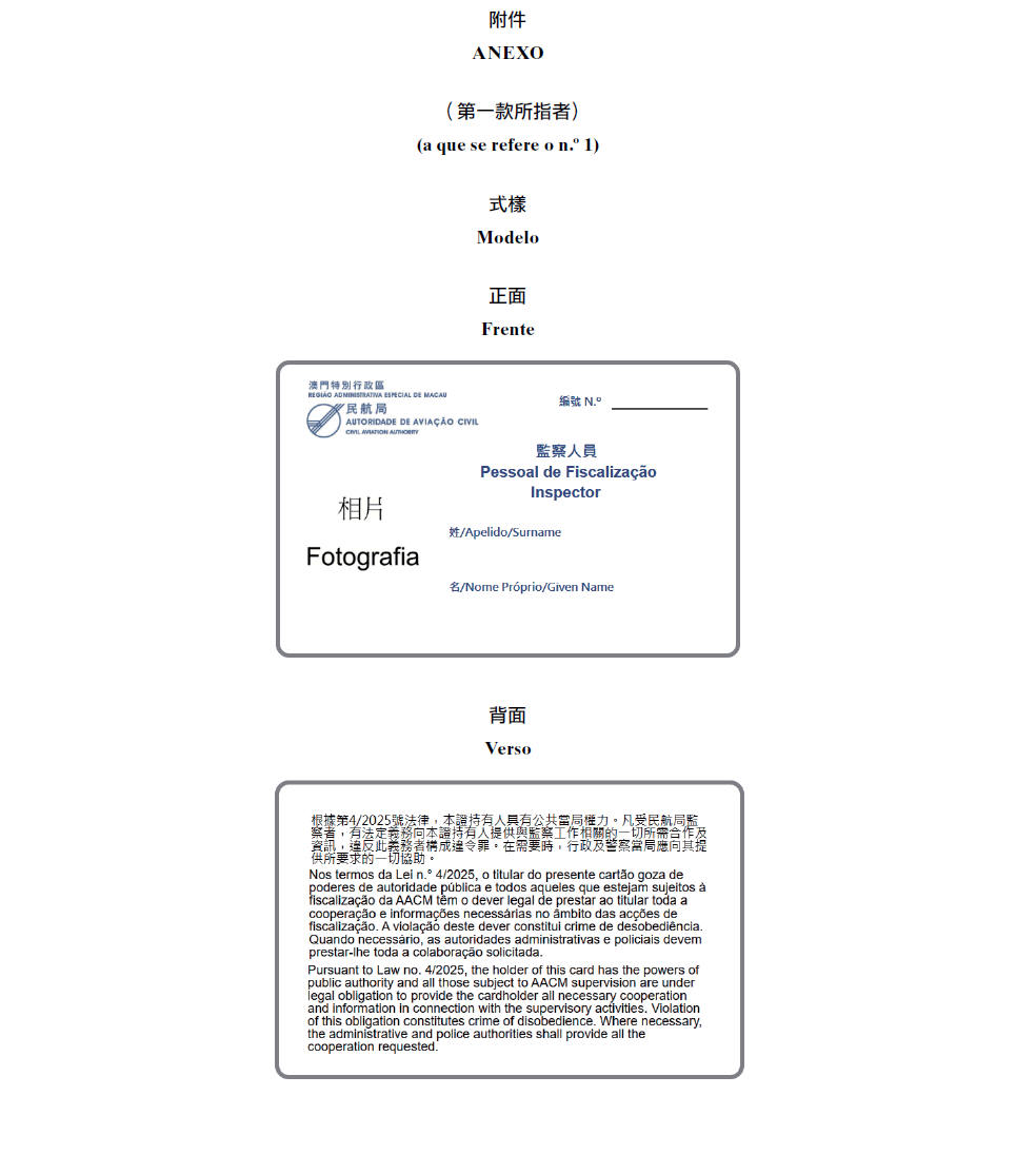 行政長官行使《澳門特別行政區基本法》第五十條賦予的職權,並根據第4/2025號法律《民航活動法》第七十二條第一款(一)項的規定,作出本批示。