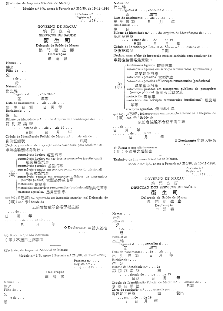 4 - As inspecções médico-sanitárias referidas no n.º 1 deste artigo, efectuar-se-ão mediante o preenchimento, pelo interessado, respectivamente das declarações, modelos n.os 6-A e 7-A anexos a este regulamento e apresentação correspondentemente dos boletins de inspecção, modelos n.os 8-A e 9-A também anexos ao presente regulamento.