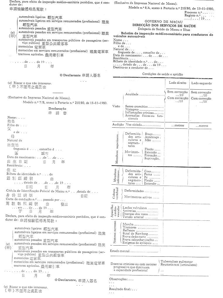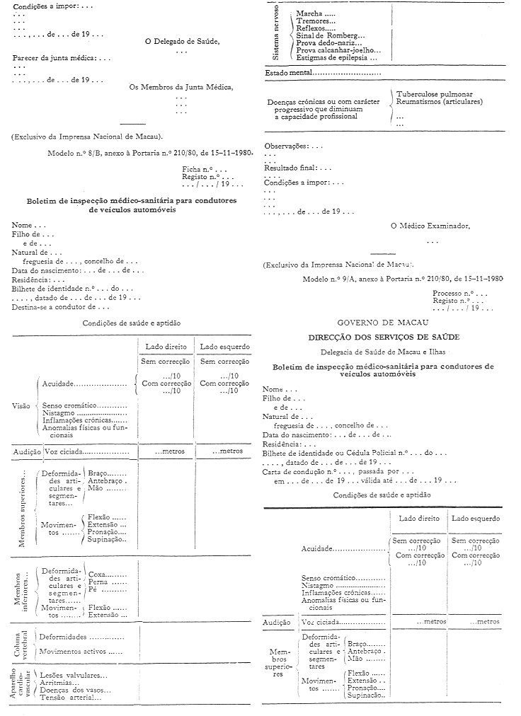 1 - As inspecções médico-sanitárias dos candidatos a condutores de veículos automóveis assim como a verificação periódica da aptidão física dos mesmos condutores, poderão realizar-se nas sedes das Delegacias de Saúde de Macau e das Ilhas e serão efectuadas pelos delegados de Saúde ou respectivos médicos-adjuntos.