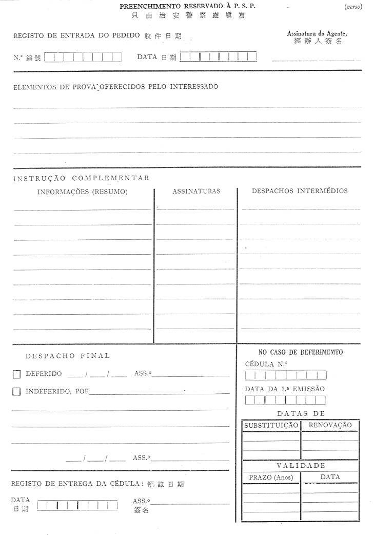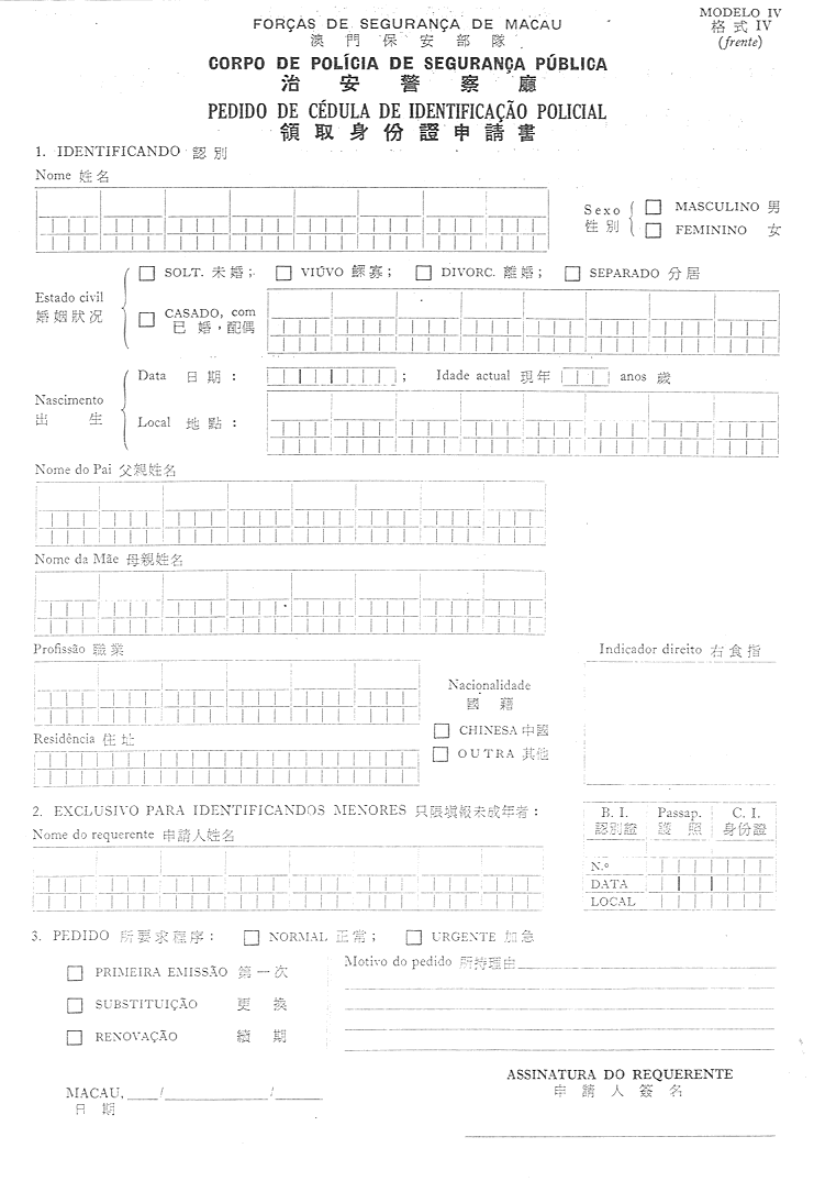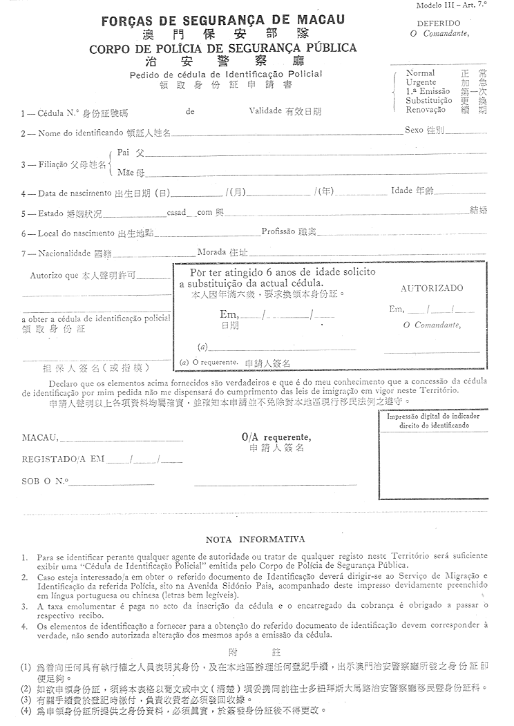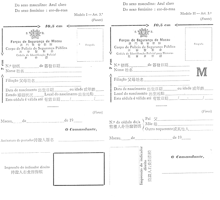 在現行之本地區身份認別制度未改革前,居住本地區之任何華籍人士,圴得領取澳門治安警察廳所發之身份證。
