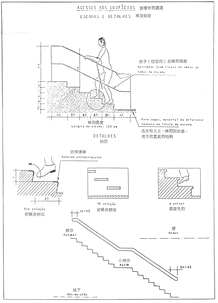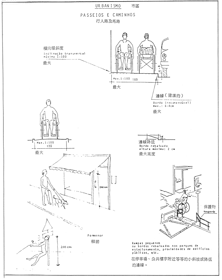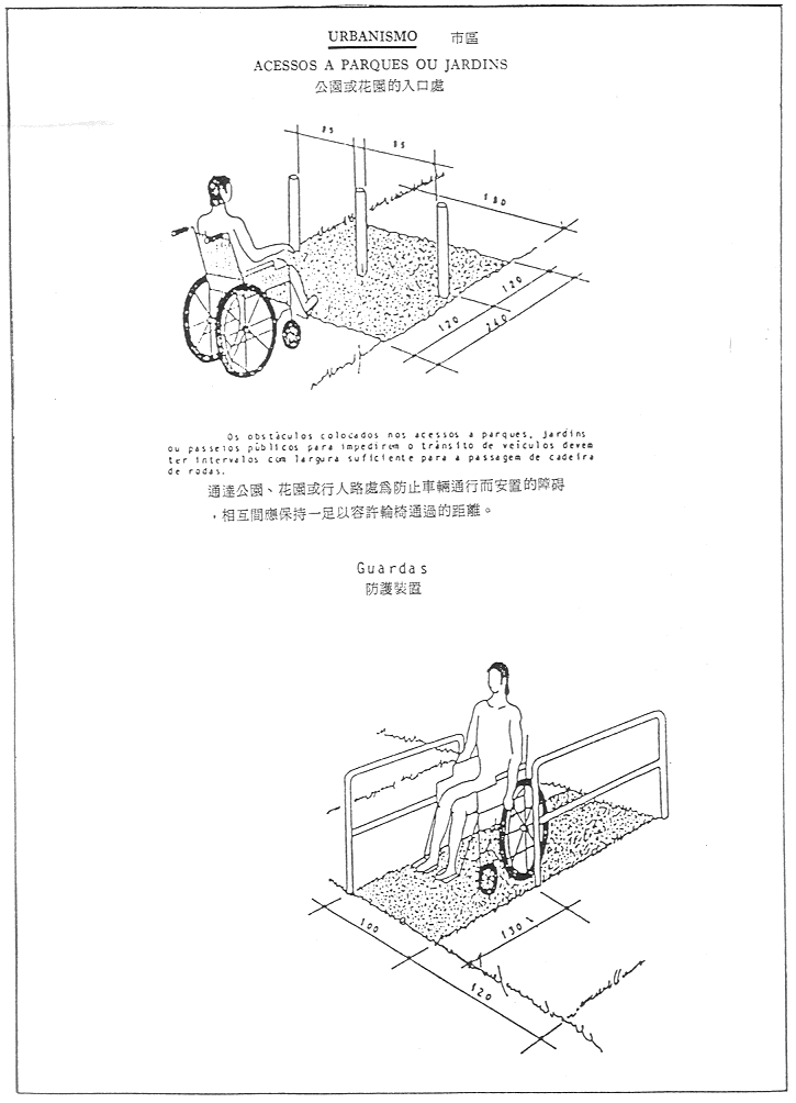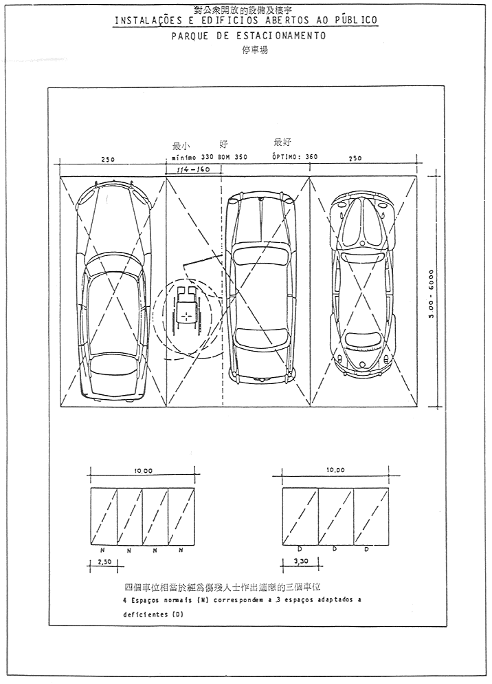 | 停車場 | 將為傷殘人士保留空間的最小面積──三三○公分乘五○○公分 建議面積以便預見一個側面的留空空間為一一四公分至三六○公分乘五○○公分用黃線劃出 有可到達標誌的指示牌 無傾斜的通道或用有一個更大傾斜度為一比一式的小斜坡 往地下停車場的通道: 用有一個最大傾斜度為百分之五的斜坡: 用升降機 |