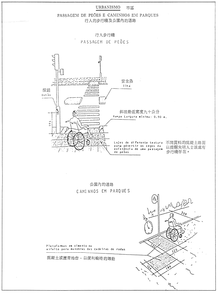 | 學校及供訓練之樓宇及設施 | 在上數章所定一般規則將以類推方法予以實施 若干樓宇至其他樓宇之通道將為平滑的並盡可能有物覆蓋 濶度最小為一五○公分更佳為一八○公分的走廊無門檻的向外開啟的門,門口為九○至一○○公分 在多層樓宇內已作出適應的升降機 每十有一已作適應的洗手間 已作適應的花灑浴室一間 為教學用的所有地方(課室、實驗室等)按照現在所制訂的一般規則係供坐輪椅傷殘人士來往的範圍 |