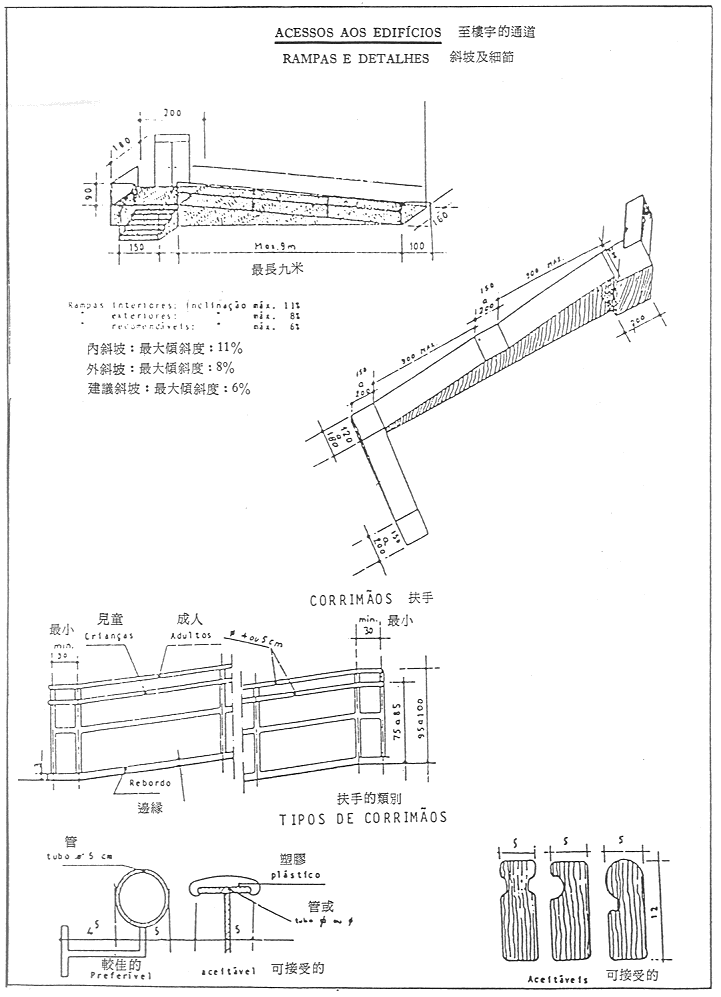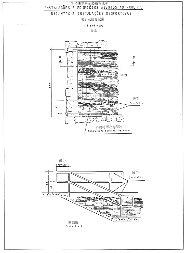 | R | R | 游泳池: 在本附件定出梯之長度及梯級; 緊接的梯有供輪椅用的斜坡; 梯兩邊雙重的扶手及斜坡,其高度分別為四六及八五公分,而向末端的伸展最小為四○公分; |