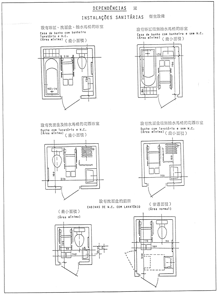 | 無坐廁的浴室 | 最小面積── 一九○公分乘一七○公分。 | ||||||||||||||||||||||||||||||||||||||||