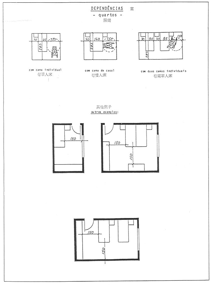 | 有獨睡牀及房間 | V | R | 最小面積── 三一五公分乘二八五公分。 建議面積── 三八五公分乘三三五公分。 傢私脚的收藏: 深度── 一五至二○公分 高度── 二五至三○公分 倘為 牀的高度──五○至五五公分 |