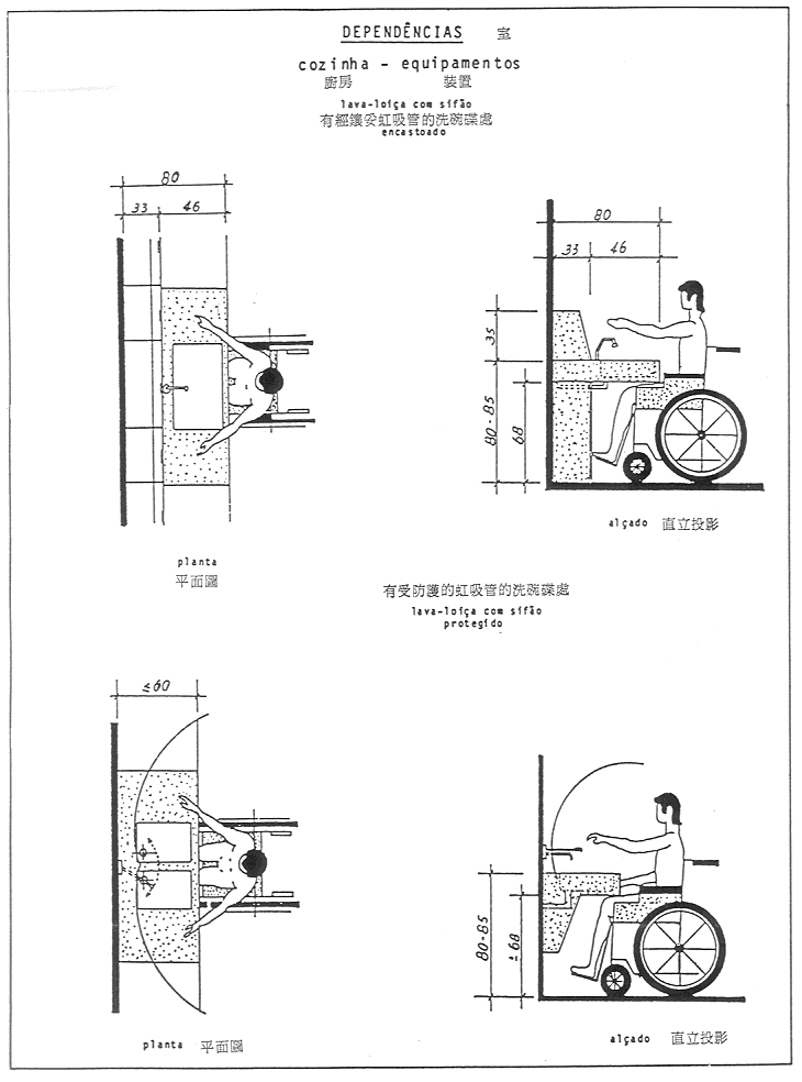 | 洗碗盆: 高度──八○至九○公分之間; 介乎七○至七五公分之間的下面留空的空間; 裝嵌或有隔熱的虹吸管; 連接在虹吸管倘有的搗碎餘饌器,裝嵌的或受防護的; 盆的深度── 一五公分; 有鵠頸的水龍頭及混合器。 |
