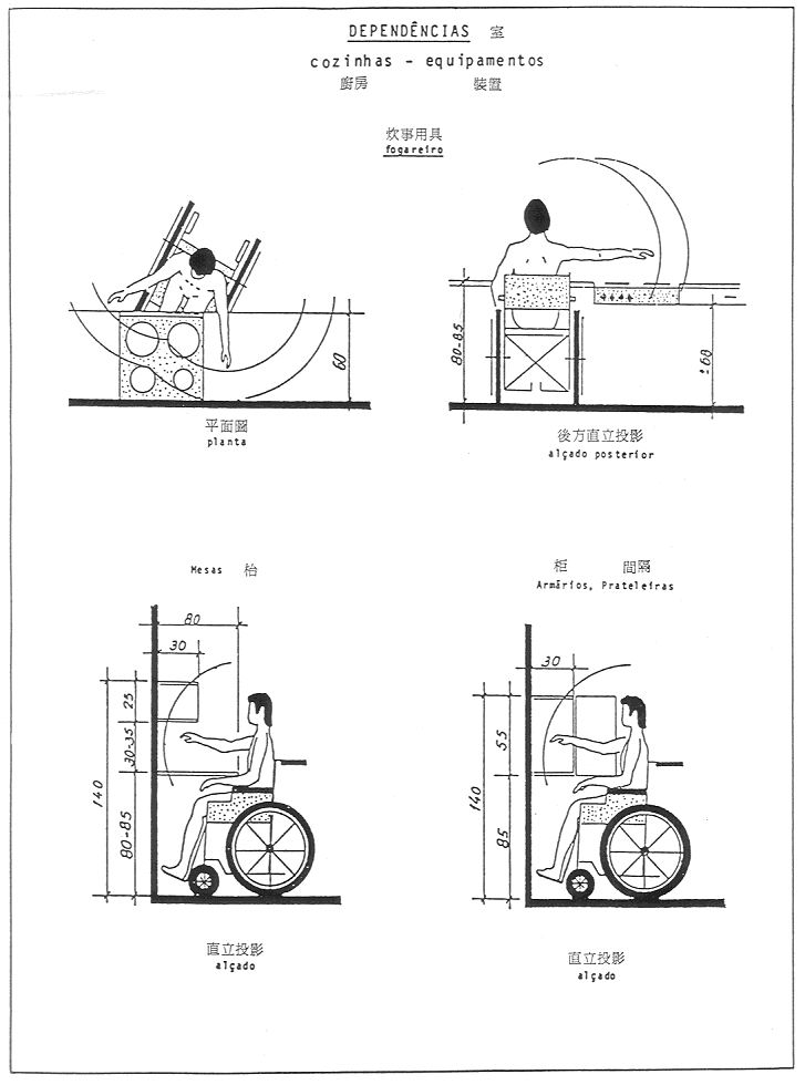 | 飯廳的枱 | 高度──七五至八○公分。 下面留空空間──七○至七五公分。 為一名輪椅使用者所使用之必需面積──八○公分乘一一○公分。 |